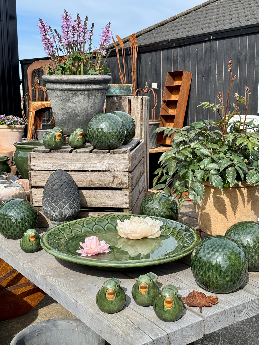 Vi har også krukkeføtter, blomsterstøtter, vannspeil, fuglebad og andre lekre detaljer som lager stemning i hagen.
